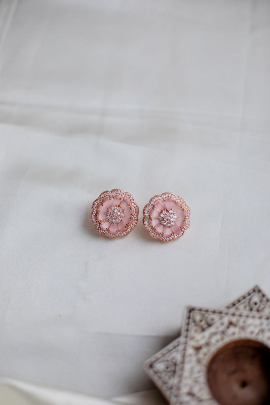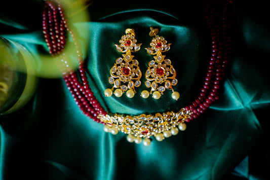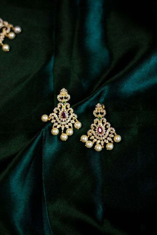 Long Pearl Mala with AD flower pendant with stud -Red, Green & White