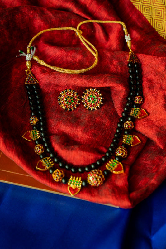 KEMP 2 layered black beads with peacock Haaram & jhumka Hangings