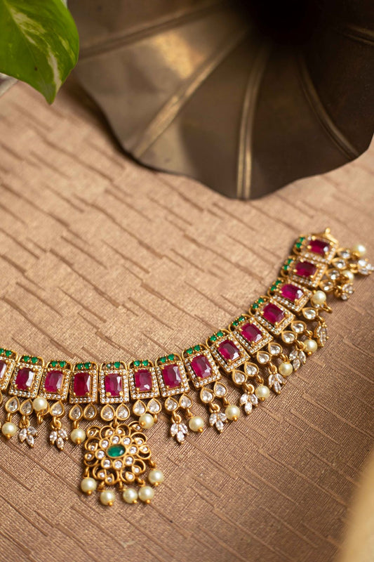 Matte Finish Square Sequnce Ruby Chocker with stud - Model 1