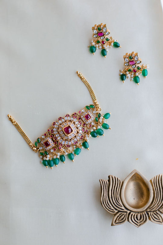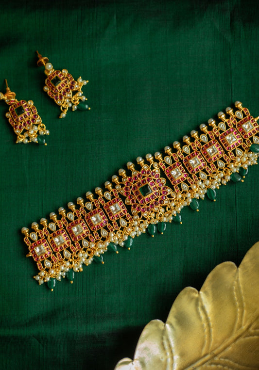 Matte Finish Square Sequnce Ruby & pearl Chocker with stud - Model #3