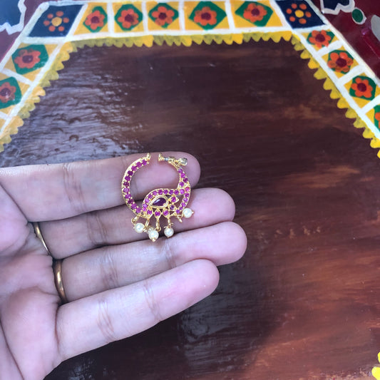 Gold finish AD medium size Nath - Peacock Model 1 with pearl hangings