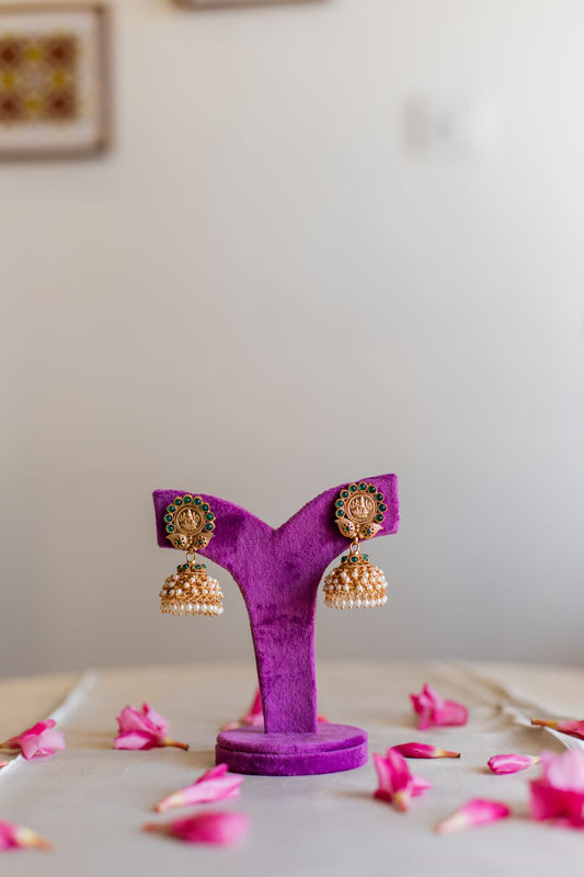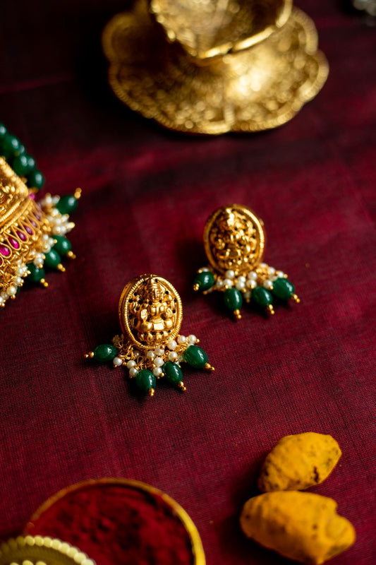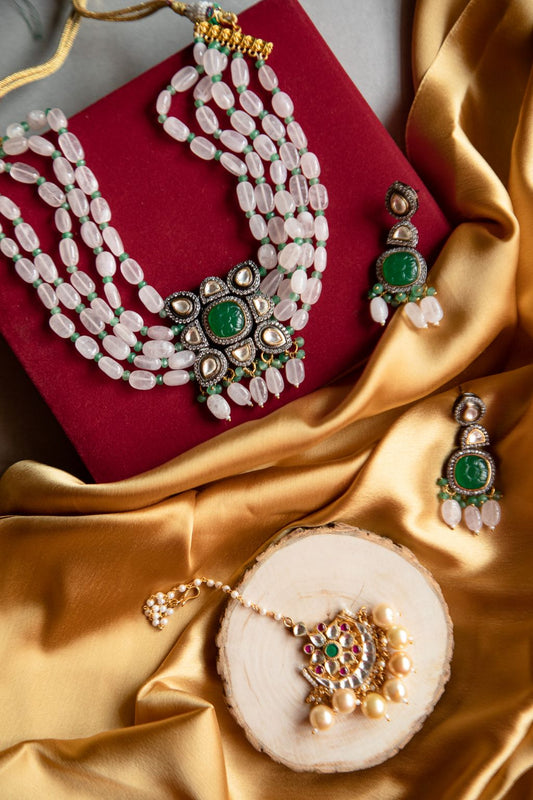 3 Layer green crystal high neck chocker with Lakshmi Stud