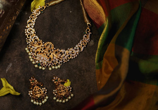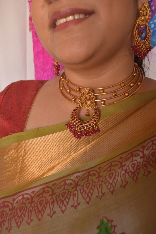 Twin peacock Lakshmi carving chocker small with lakshmi stud