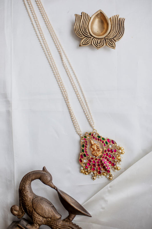 Gold Finish Pearlchain with Reverse lotus Lakshmi pendant Necklace #26