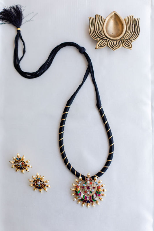 Gold Finish BLACK Thread Necklace with Half moon Flower Pedantant - Navaratna #29