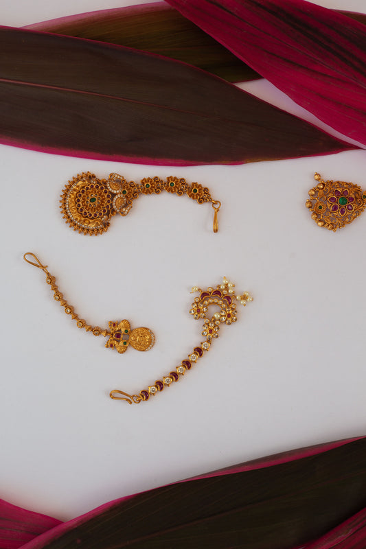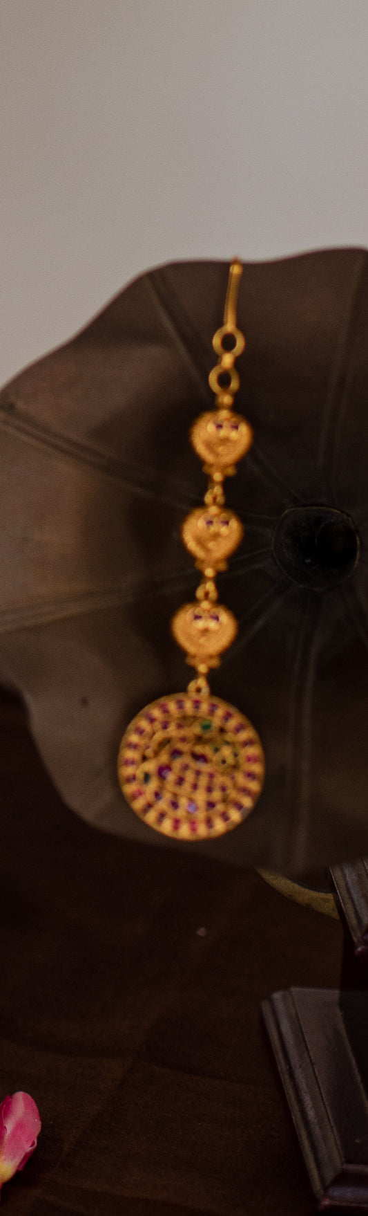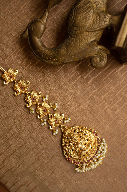 Gold Finish Nagasu Tikka mango motifs model with Lakshmi Carving Nagasu -Ruby
