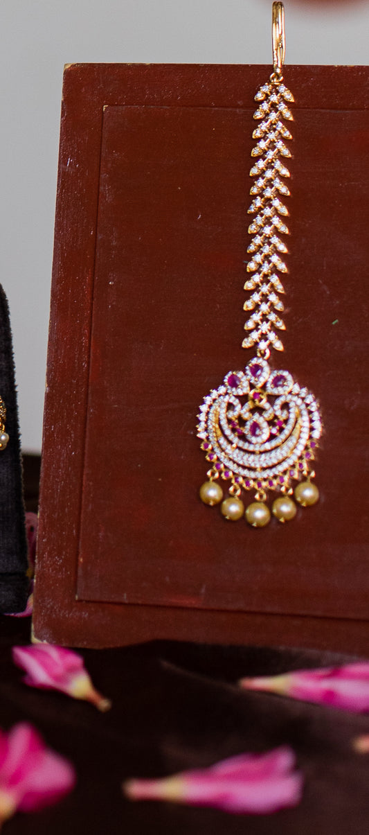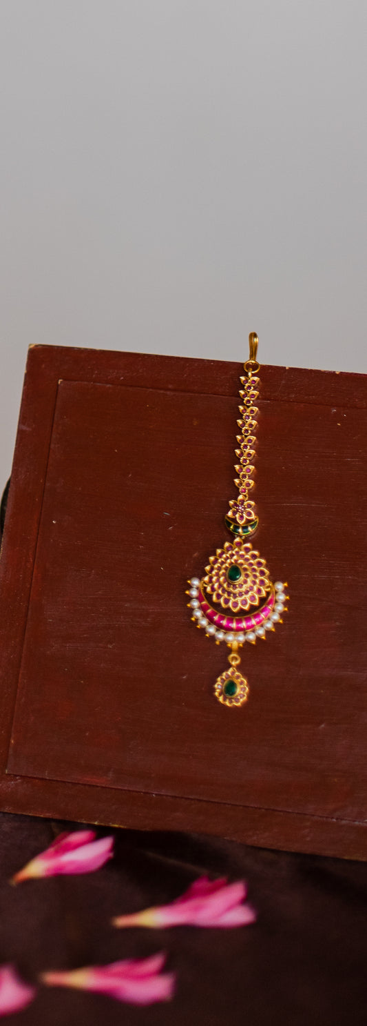 Jadau Stone Statement Tikka with pearl & gold hangings & Single Layer - White, Green Red