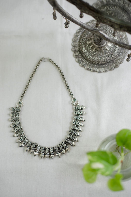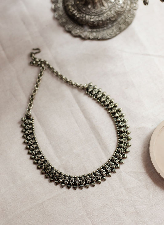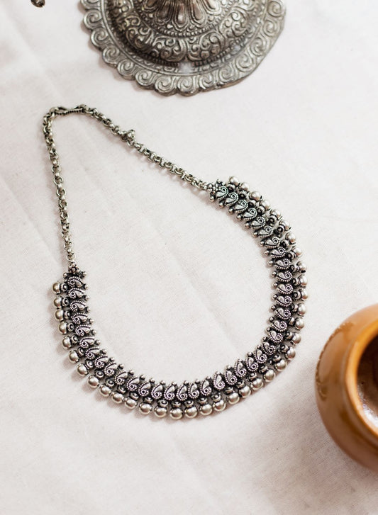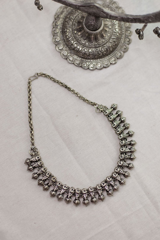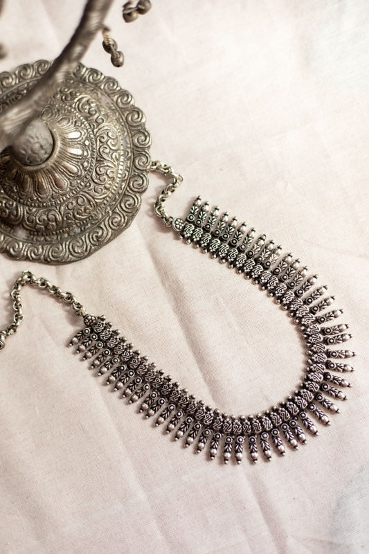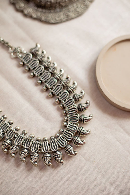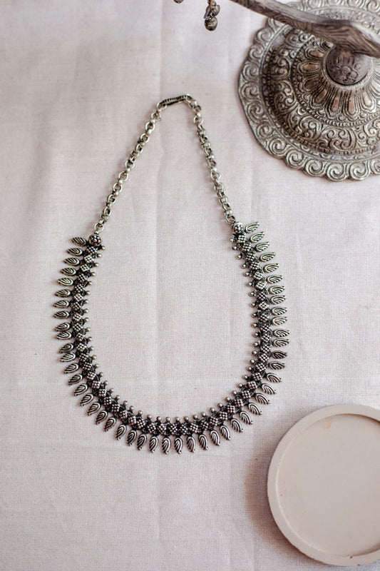 Silver Finish tiny mango motifs with spikes droplets - Mini Kolhapuri Necklace