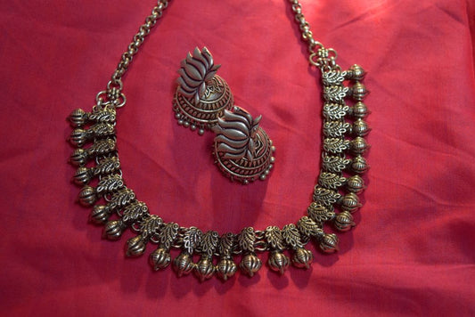 Silver Finish Half-Peacock sequence Necklace with Lotus bud (pumpkin beads) - Kolhapuri Necklace