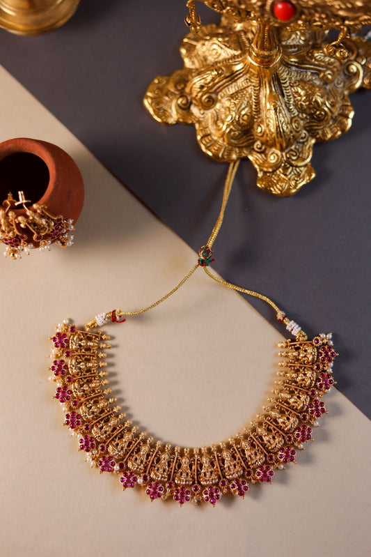 Matte finish Sequence Lakshmi & Stone flower Necklace - 70C