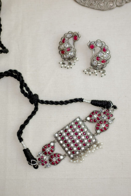 Silver Finish Mango motifs with square pendant high neck chocker - 45