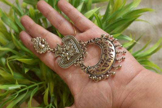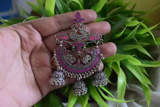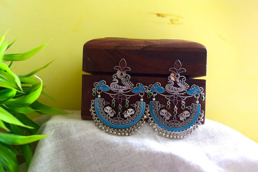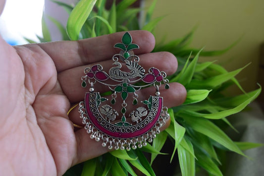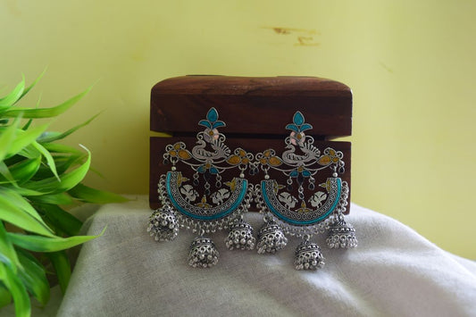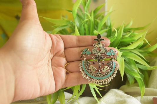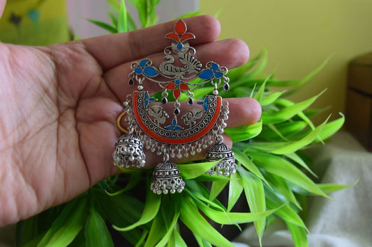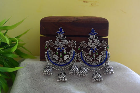 Oxidised Peacock Carving Enamel Chandbali With Jhumka-71B