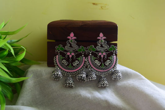 Oxidised Peacock Carving Enamel Chandbali With Jhumka-71F