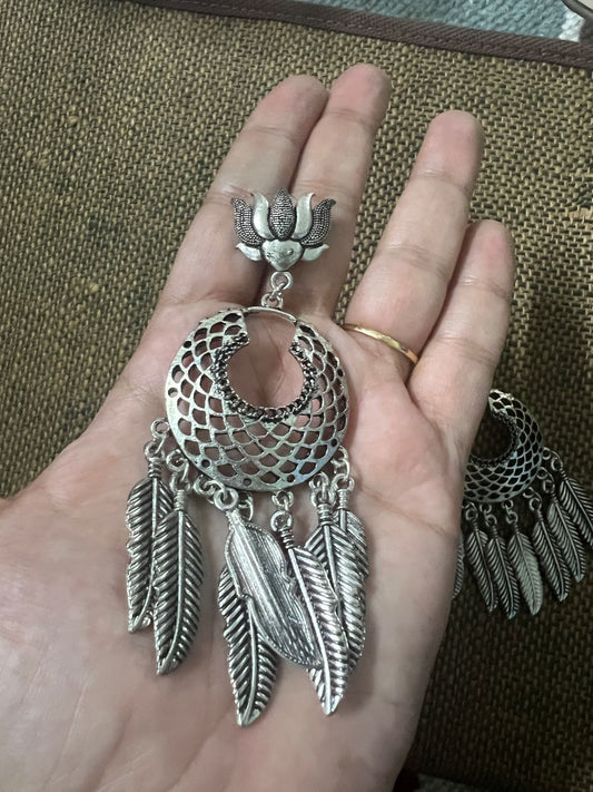 Oxidised Lotus Stud With Multiple Feathers Chandbali