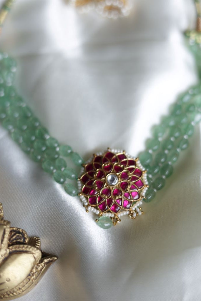 Gold Finish Crystal High Neck chocker with Flower pendant & earrings - Pastel Green & pink